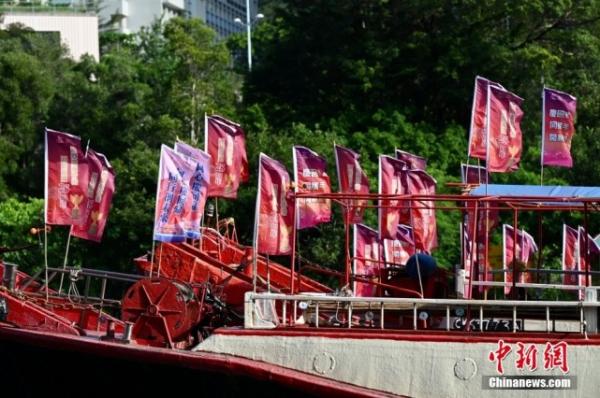 6月26日,停泊于香港南区香港仔避风塘的渔船悬挂国旗及区旗,当中一艘渔船上树立大型传统花牌,庆香港回归祖国25周年。图为香港仔避风塘的渔船上大型传统花牌庆回归。 中新社记者 李志华 摄
