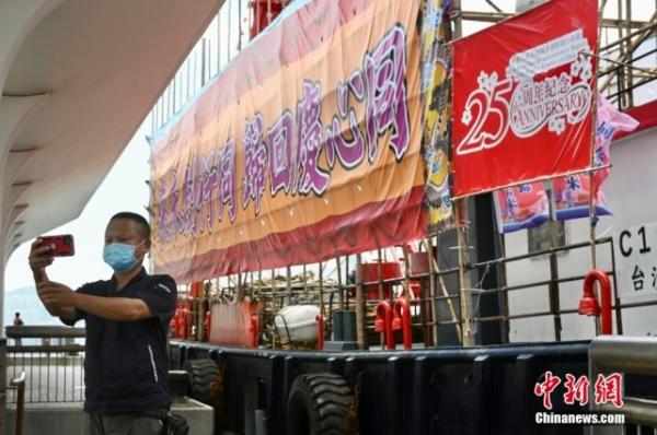 6月28日,香港各界庆典委员会举办“庆祝香港回归祖国25周年”系列活动,安排悬挂国旗、区旗及标语的渔船于维多利亚港上巡游庆回归。图为市民与“庆祝号”渔船合照。 中新社记者 李志华 摄