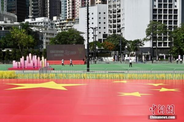6月28日,香港各界庆典委员会于铜锣湾维多利亚公园以庆回归为主题设置不同的大型展示打卡装置,如国旗及区旗展示、水幕特效展示及特色打卡点等,开放予公众参观。图为国旗展示。 中新社记者 李志华 摄