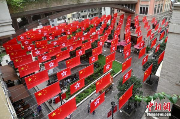 6月27日,市民拍摄尖沙咀栢丽购物大道上的国旗及区旗。 中新社记者 李志华 摄