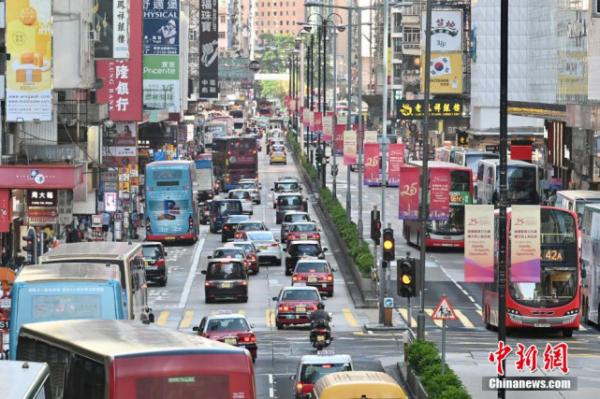 6月24日,随着香港回归祖国25周年纪念日临近,香港九龙的旺角、太子、深水埗多区随处可见庆祝香港回归祖国25周年的横幅、海报等,喜庆气氛浓。图为旺角的弥敦道灯柱上的庆回归广告。 中新社记者 李志华 摄