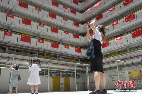 6月25日,随着香港回归祖国25周年纪念日临近,香港九龙东各地随处可见庆祝香港回归25周年的横幅、海报等,喜庆气氛浓。图为坪石邨一住宅楼挂满国旗和区旗,吸引市民到场拍照。 中新社记者 陈永诺 摄