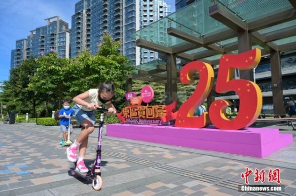 6月27日,随着香港回归祖国25周年纪念日临近,香港北角随处可见庆祝香港回归25周年的横幅、海报等,喜庆气氛浓。图为庆祝香港回归25周年的摆设。 中新社记者 陈永诺 摄