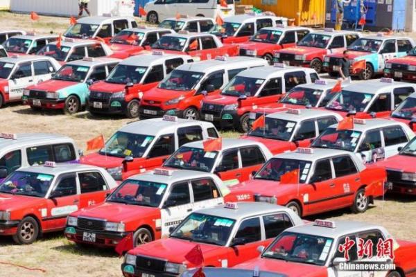 6月28日,香港的士司机从业员总会在港岛举行庆祝香港回归25周年的士巡游活动。巡游开始前,100多辆挂国旗、贴海报的出租车在中环海滨空地摆出“25”字样,庆祝香港回归25周年。 中新社记者 张炜 摄