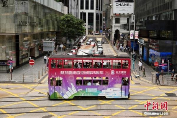 6月21日,一辆车身贴有庆祝香港回归25周年的电车经过中环街头。随着香港回归25周年纪念日临近,香港街头到处洋溢着庆回归的喜庆气氛。 中新社记者 张炜 摄