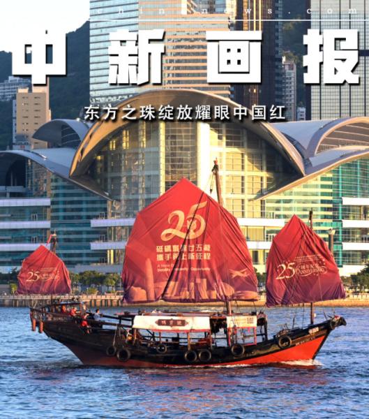 香港回归祖国25周年在即,连日来,香港各界举办形式多样的庆祝活动,街头巷尾悬挂起国旗和区旗,鲜艳的中国红成为整座城市的亮丽底色,这座傲然屹立的东方之珠绽放着耀眼的光彩。 图为印有“庆祝香港回归25周年”字样的帆船在维多利亚港行驶。 中新社记者 陈永诺 摄
