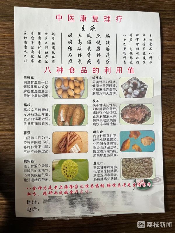 据初步调查,该店取得了营业执照,但未申领其他证照。“八食神方”的宣传内容由经营者本人编写,无科学依据,对商品的功能做了夸大、虚假的宣传。当事人在从事康复理疗的同时,推销虚假宣传疗效的产品,对消费者构成误导。