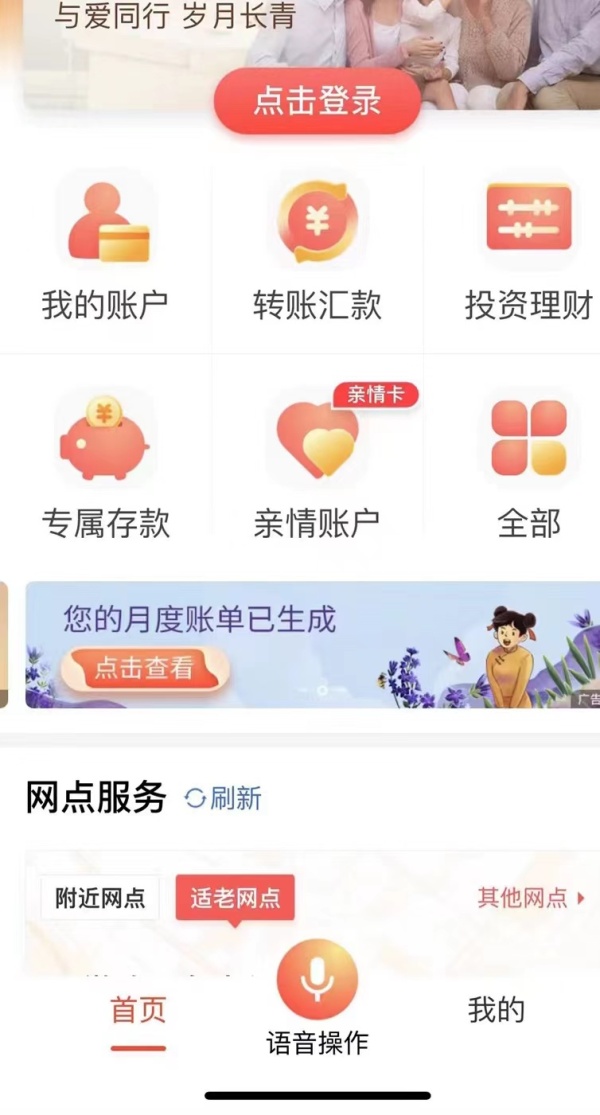 近年来,多家银行在适老服务方面积极探索,推出适老版、关怀版模式的手机银行系统。适老版相较于标准版,字体更大,功能和界面更加简洁实用,除基础的账户查询、转账汇款、投资理财等必要模块外没有过多复杂选项,极大简化了操作难度,提高了使用便利性,且伴有语音操作功能,老年人客户无需输入文字,通过语音就可以办理业务,并配有语音播报。