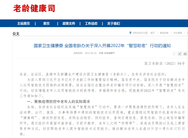为助力老年人跨越“数字鸿沟”,近日国家卫生健康委、全国老龄办发出《关于深入开展2022年“智慧助老”行动的通知》,要求各地切实解决老年人运用智能技术困难,深入开展“智慧助老”行动。
