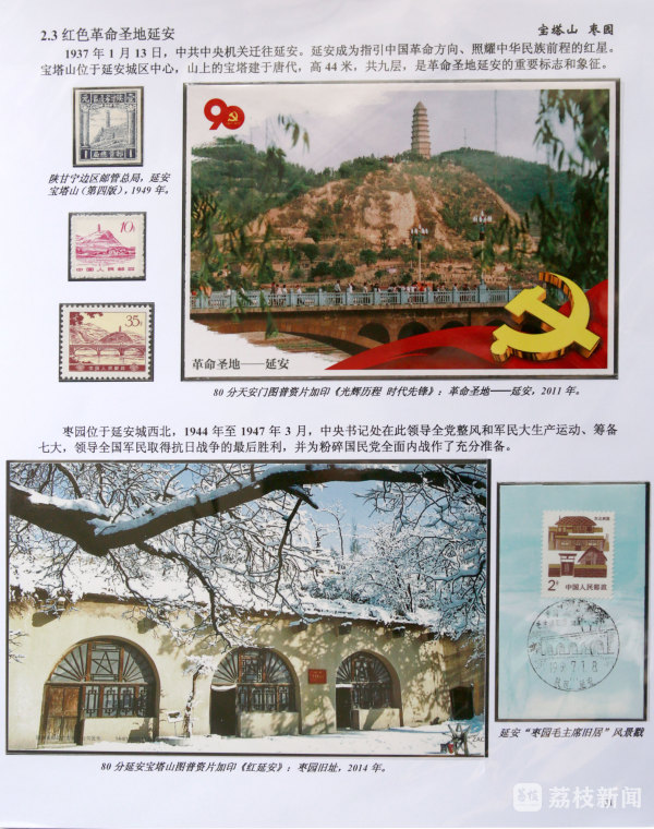 标志性的宝塔山,泛黄票面上“陕甘宁边区”的繁体字,昭示着一枚邮票的年代感。这枚小小的邮票由陕甘宁边区邮管总局发行于1949年,在这页贴片上还有另外数张不同年代发行的以“红色革命圣地延安”为主题的邮品,这是黄国建四部党史专题邮集中的一页。