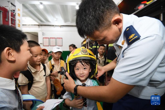 6月30日,贵州省贵阳市第十一幼儿园的小朋友在贵阳市南明区消防救援大队体验消防救援头盔。新华社发(赵松摄)