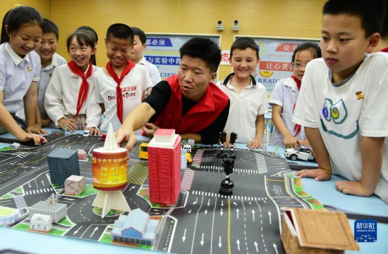 6月30日,在江苏省镇江市金山小学,江苏大学志愿者通过“模拟路况”场景为小学生演示讲解交通安全知识。新华社发(赵松摄)