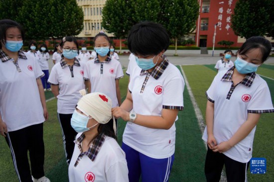 6月30日,河北省遵化市第三中学的学生在练习急救包扎技能。新华社发(赵松摄)