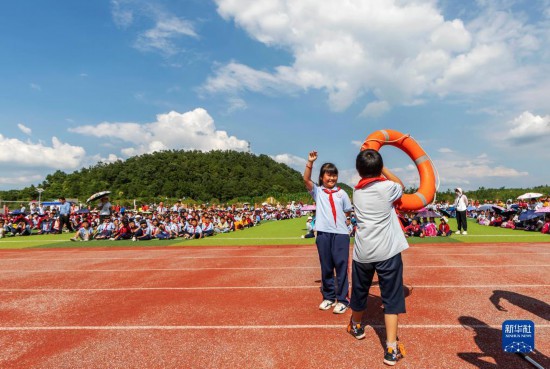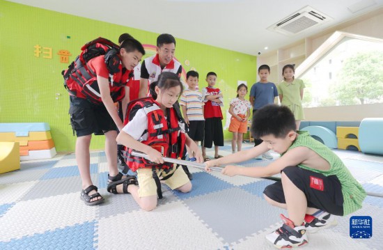 6月30日,在浙江省湖州市德清县阜溪街道狮山社区博爱家园,孩子们在红十字志愿者指导下学习水域救援伸缩杆使用方法。新华社发(赵松摄)