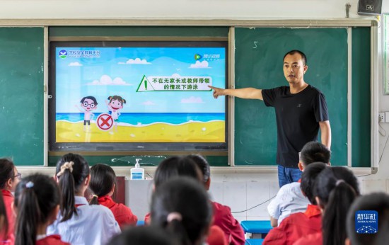 6月30日,在贵州省黔西市第十二小学开展的暑期安全教育主题班会上,老师对学生进行安全教育。新华社发(赵松摄)