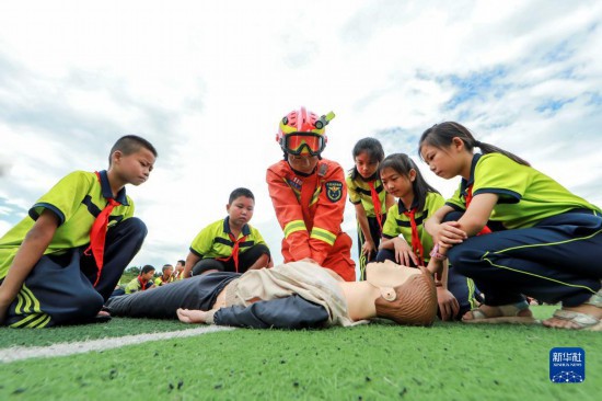 6月30日,在贵州省黔东南苗族侗族自治州岑巩县第三小学,消防员在传授心肺复苏技能。新华社发(赵松摄)