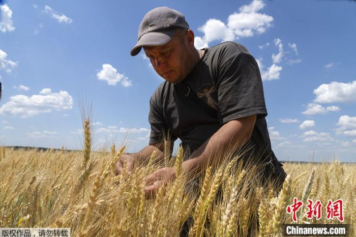 2022年6月21日,一位农民在顿涅茨克地区的田地里检查小麦的成熟度。