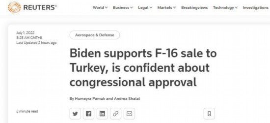 【环球网报道】据路透社报道,当地时间6月30日,美国总统拜登在西班牙马德里举行的新闻发布会上说,美国支持向土耳其出售F-16战机,并有信心使得该交易获得美国国会的批准,同时他宣称支持向土出售F-16战机“没有交换条件”。