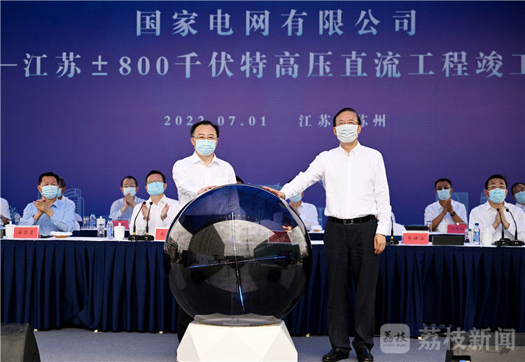 荔枝新闻讯 7月1日上午,白鹤滩—江苏±800千伏特高压直流工程竣工投产大会举行,来自西南地区的绿色清洁水电跨越2080公里,将源源不断送往江苏。江苏省委书记吴政隆、国家电网公司董事长辛保安,四川省省长黄强、国家电网公司总经理张智刚分别在江苏会场、四川会场出席大会,共同启动送电装置。