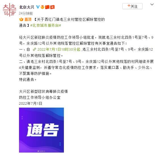 经大兴区新冠肺炎疫情防控工作领导小组批准,现就老三余村北四条1号至7号、9号,余庆路12号以外其他院落管控区解除管控有关事宜通告如下: