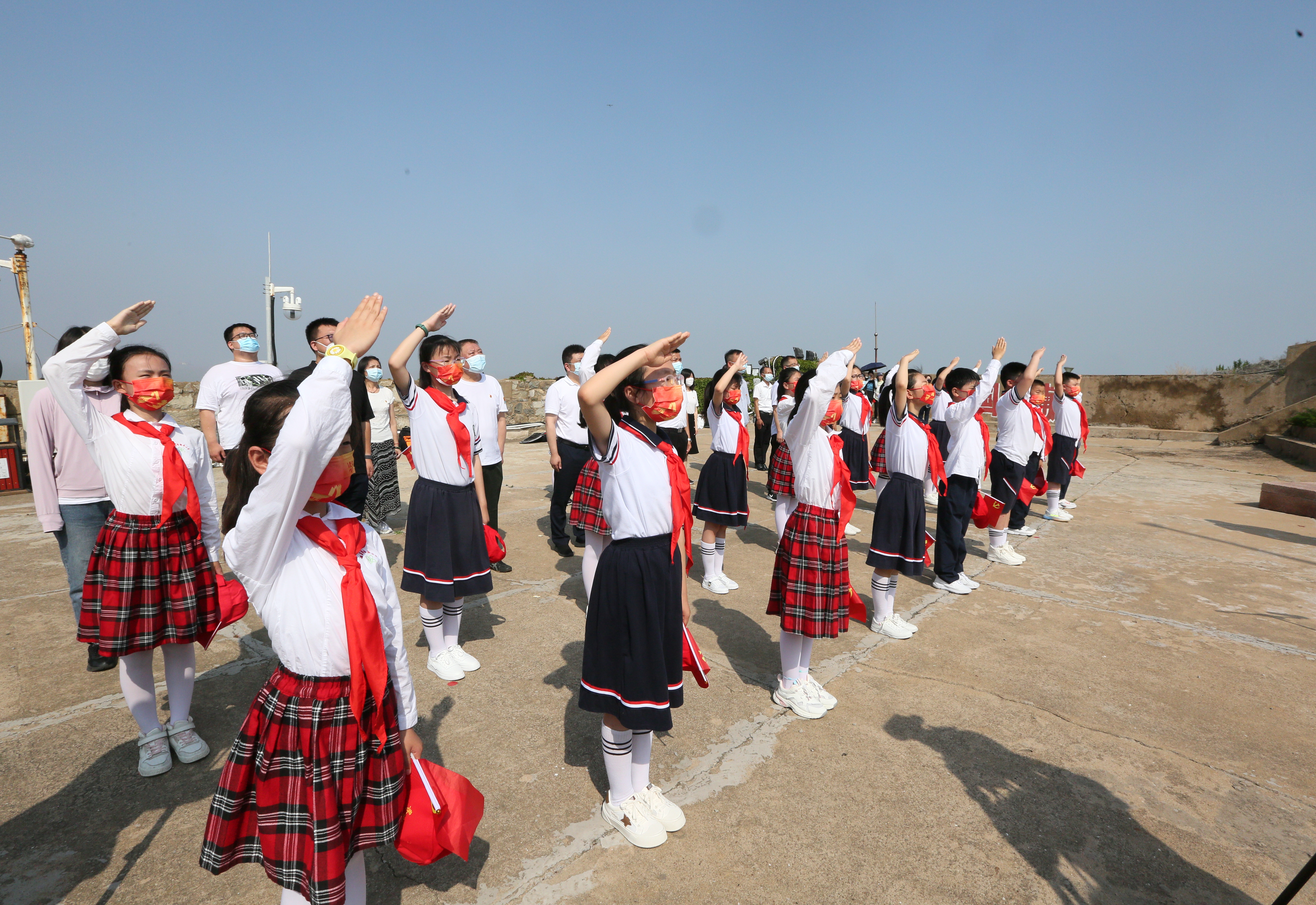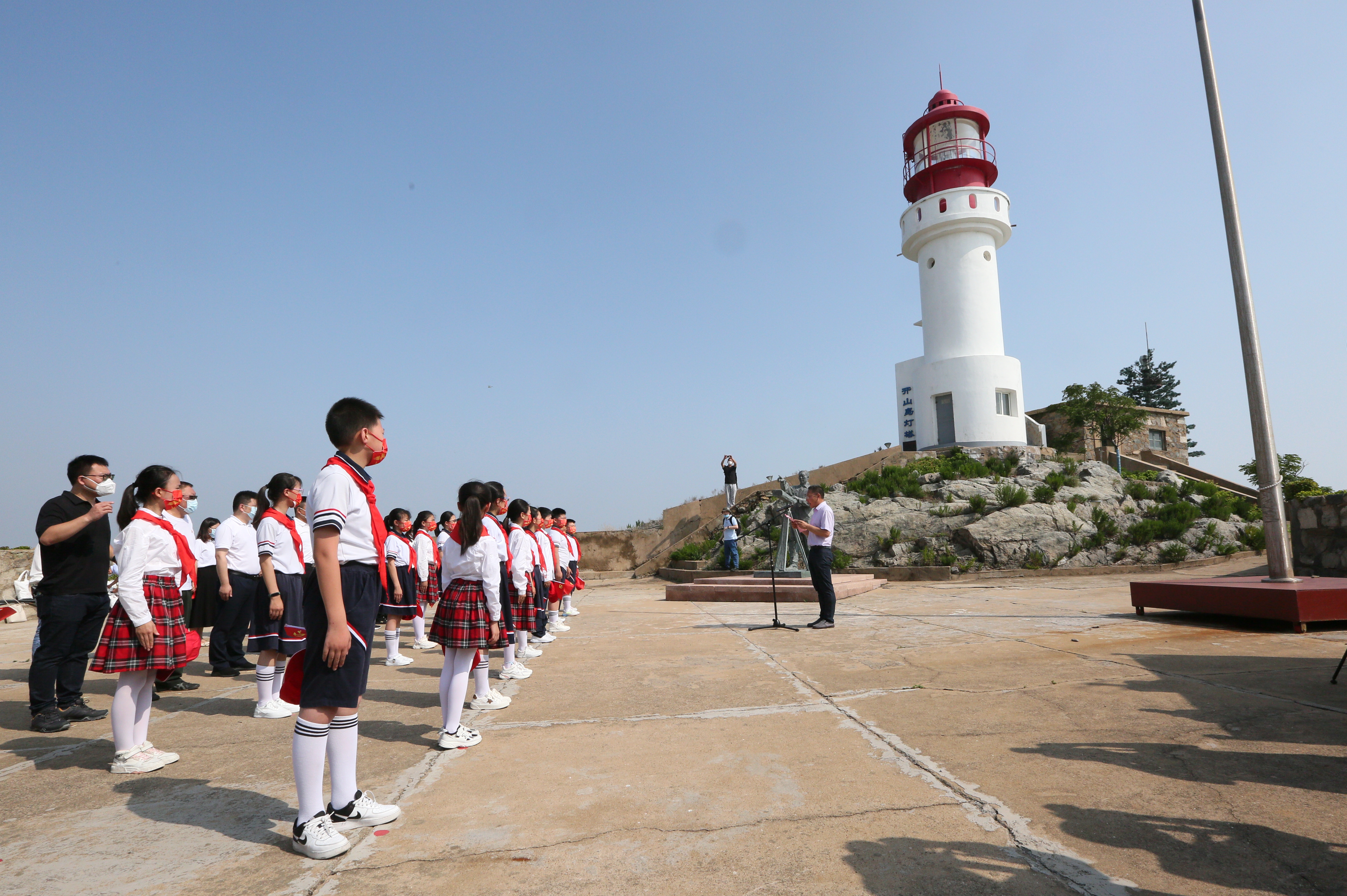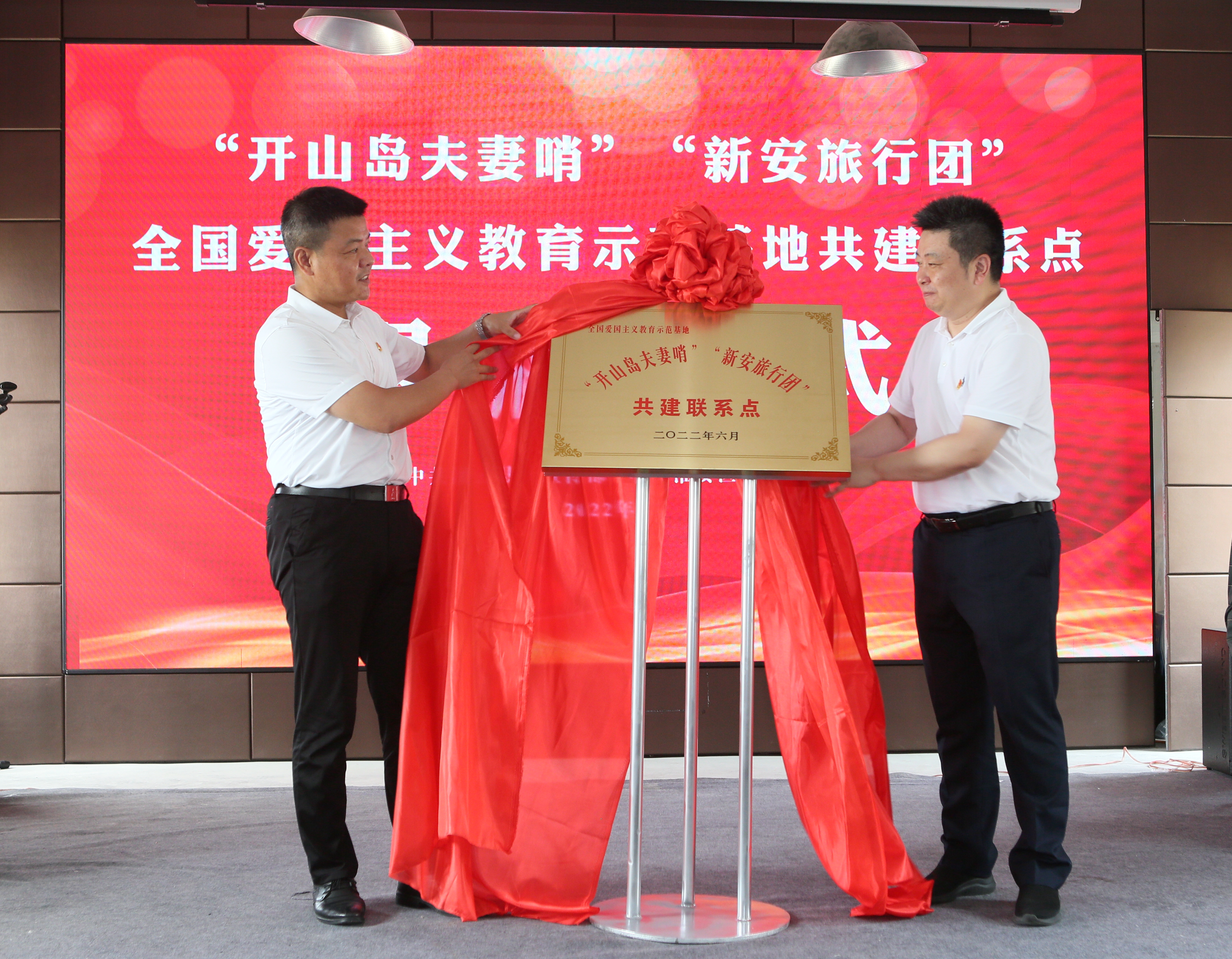 当天,开山岛上碧空如洗,新安小学和“王继才中队”的少先队员们顶着烈日来到岛顶国旗广场,9名守岛民兵扛旗走向升旗台,当鲜艳的五星红旗在海天间伴着雄壮的国歌声升起,孩子们昂首挺胸,向国旗行队礼。上午10时许,同时被中宣部命名为全国爱国主义教育示范基地的“开山岛夫妻哨”事迹陈列馆、新安旅行团历史纪念馆在哨所礼堂举行结对共建揭牌仪式,红色精神穿越时空延续、传承。