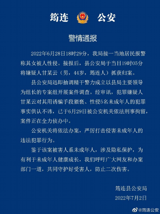 2022年6月28日18时29分,筠连县公安局接一当地居民报警称其女被人性侵。接报后,县公安局于当日19时05分将嫌疑人甘某云(男,44岁,筠连人)抓获归案。