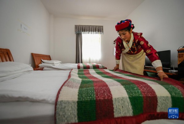 麻麻门巴新村的白玛卓玛在自己的家庭旅馆中整理床铺。新华社发(刘东君 摄)
