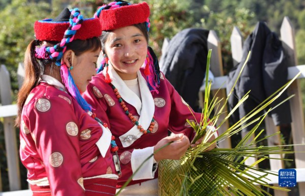 勒布沟的门巴族妇女在编织竹筐。新华社记者 觉果 摄