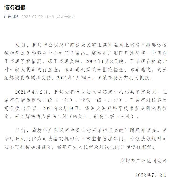荔枝新闻讯 据廊坊市广阳区司法局微信公众号消息,近日,河北省廊坊市公安局广阳分局民警王某辉在网上实名举报廊坊爱德堡司法医学鉴定中心主任马某昌。廊坊市广阳区司法局第一时间向王某辉了解情况。据王某辉反映,2002年6月8日晚,王某辉在执勤时对一辆大货车进行盘查,该车司机国某来拒绝检查、驾车逃逸,致王某辉被货车碾压受伤。2021年1月24日,国某来被公安机关抓获。