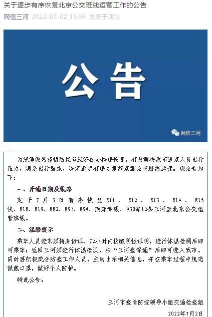 荔枝新闻讯 据网信三河微信公众号消息,三河市疫情防控领导小组交通检疫组发布关于逐步有序恢复北京公交班线运营工作的公告。全文如下: