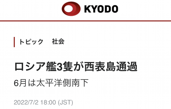 【环球网报道】日本共同社2日报道,该国防卫省当天发布消息称,3艘俄罗斯军舰7月1日晚11时许穿过冲绳县与那国岛和西表岛之间海域,驶向东海。值得注意的是,与那国岛位于日本的最西端,报道称,这是防卫省首次通报俄罗斯舰艇驶过该海域。