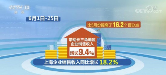 从重点区域看,前期受疫情影响较大的上海正在加快恢复,区域带动作用逐渐显现。6月1日—25日,上海企业销售收入同比增长18.2%,带动长三角地区的企业销售收入增长9.4%,比5月份提高了16.2个百分点。