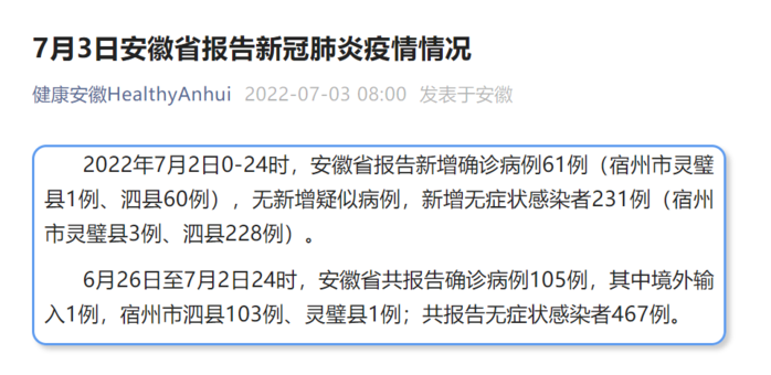6月26日至7月2日24时,安徽省共报告确诊病例105例,其中境外输入1例,宿州市泗县103例、灵璧县1例;共报告无症状感染者467例。