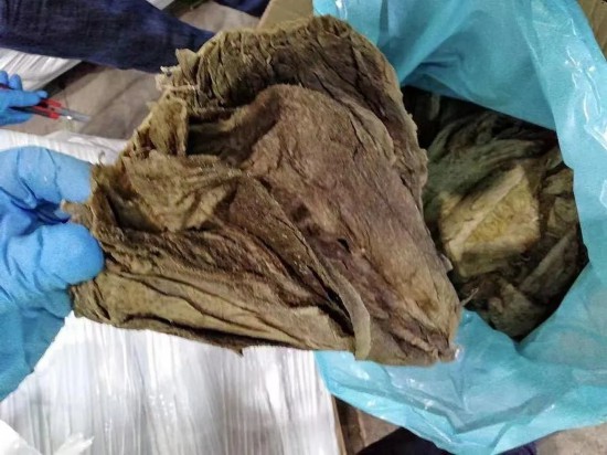 大鹏海关对一批申报为“瓦楞芯纸”的货物进行查验,开拆纸箱包装及塑料袋裹装后,发现货物为一块块固体状、颜色灰黄或发黑物体,散发刺激性腐败、酸臭气味。经鉴定,该批货物为牛的重瓣胃组织(俗称牛百叶),已腐臭变质,属于国家禁止进口的“洋垃圾”。