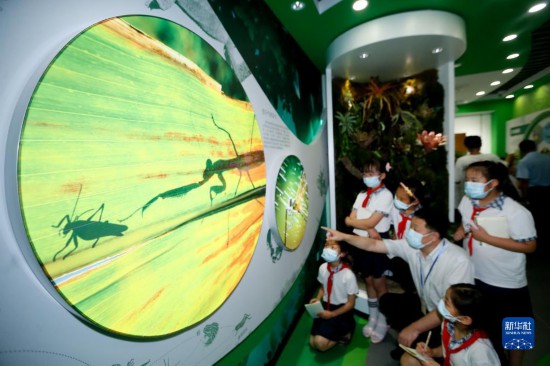 7月1日,中国农科院青岛特种作物研究中心试验基地田园昆虫科普馆的工作人员为小学生讲解生物知识。新华社发(梁孝鹏 摄)