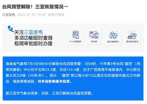 荔枝新闻讯 据“三亚发布”微信公众号消息,“暹芭”对海南省影响基本结束,以下是台风预警解除后的海南、三亚恢复情况:
