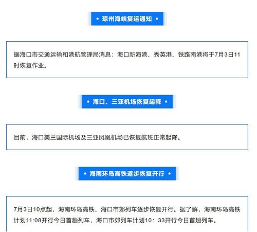 7月3日10点起,海南环岛高铁、海口市郊列车逐步恢复开行。据了解,海南环岛高铁计划11:08开行今日首趟列车,海口市郊列车计划10:33开行今日首趟列车。