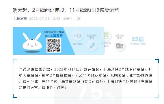 荔枝新闻讯 据上海发布微信公众号7月3日消息,申通地铁集团介绍,2022年7月4日运营开始起,上海地铁2号线徐泾东站、虹桥火车站站、虹桥2号航站楼站,以及11号线花桥站、光明路站、兆丰路站恢复运营。至此,除11号线上海赛车场站仍暂停运营外,上海地铁全网其他所有车站均提供正常运营服务。详见↓