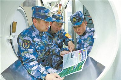 北部战区海军某潜艇官兵阅读自制小报《铁鲨快线》。茆琳摄