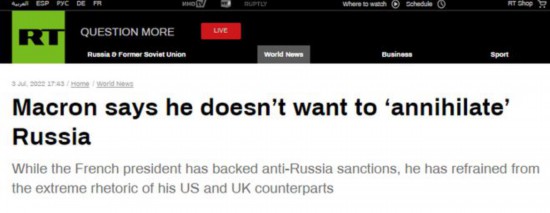 RT称,在这一表态前,马克龙已经因为和俄罗斯总统普京保持着联系受到乌克兰一些狂热支持者的批评。俄方也曾对马克龙作出评价,据俄罗斯塔斯社消息,俄外交部长拉夫罗夫7月1日表示,欧盟国家领导层对如今欧洲大陆上的主要角色不是他们自己、而是美国的这一情况感到“满意”,但法国总统马克龙是唯一的“例外”。