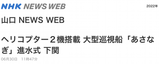 日本广播协会(NHK)6月30日报道,可搭载两架直升机的海上保安厅大型巡逻船“朝凪”号当天在山口县三菱重工下关造船所进行了下水仪式。值得注意的是,报道声称,日本海上保安厅为了强化在所谓“尖阁诸岛”(即我钓鱼岛及其附属岛屿)附近等海域的警戒活动,正在推进巡逻船建造计划,“朝凪”号则是该计划的一环。