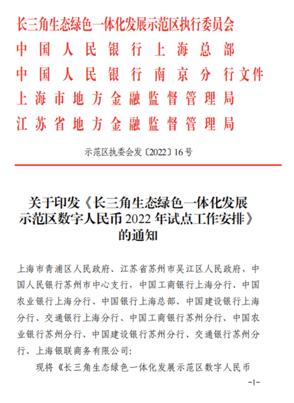 记者今天(7月5日)获悉, 为进一步推进示范区支付一体化和同城化,增强示范区金融活力,推动示范区高质量一体化发展,全力凸显示范区数字人民币试点创新成效,根据上海市、江苏省人民政府和中国人民银行工作部署,示范区执委会联合中国人民银行上海总部、中国人民银行南京分行,上海市地方金融监督管理局、江苏省地方金融监督管理局于近期印发了《示范区数字人民币2022年试点工作安排》,明确了示范区2022年数字人民币创新试点工作场景及任务分工。