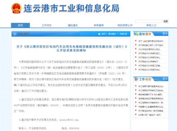 6月底,连云港市工业和信息化局在其官网发布关于《连云港市居住区电动汽车自用充电基础设施建设的实施办法(试行)》公开征求意见的通知。《办法》对居住区自用充电设施建设标准、居住区自用充电设施申报流程等公开征求意见。