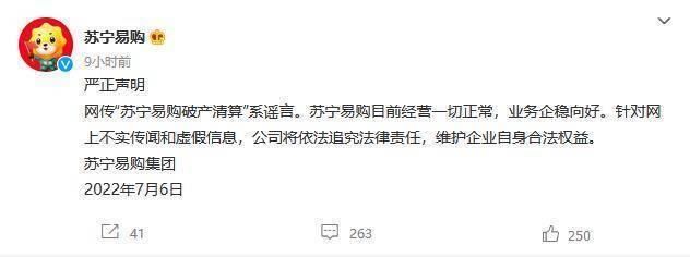 荔枝新闻讯 7月6日凌晨,苏宁易购官方微博发布严正声明称,网传“苏宁易购破产清算”系谣言。苏宁易购目前经营一切正常,业务企稳向好。
