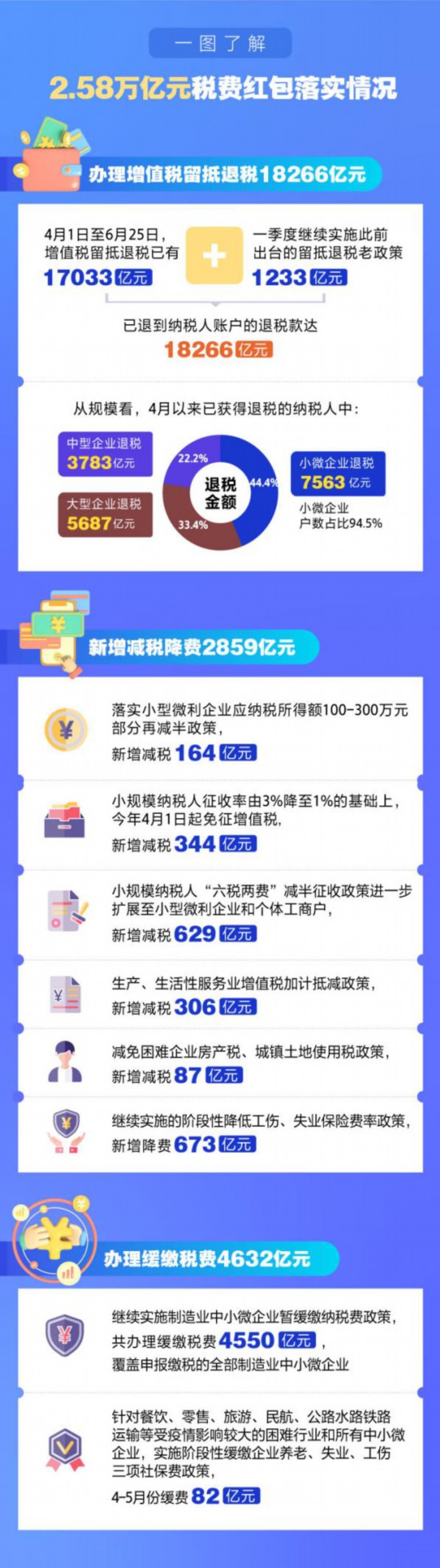 国家税务总局数据显示,截至6月25日,新的组合式税费支持政策累计新增退税减税降费及缓税缓费约2.58万亿元。预计上半年新的组合式税费支持政策将新增退税减税降费及缓税缓费约2.86万亿元。