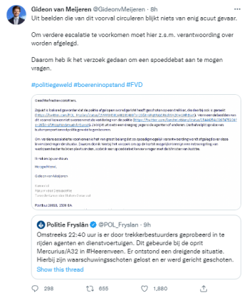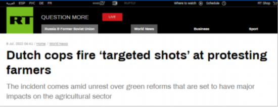 RT称,荷兰保守派议员吉迪恩·范·梅杰伦认为,视频中没有显示任何人面临“迫在眉睫的危险”,他敦促荷兰政府“尽快”解释这一明显差异,并称已要求议会进行紧急辩论。这条推文加上了“警察暴力”和“农民反抗”的话题标签。