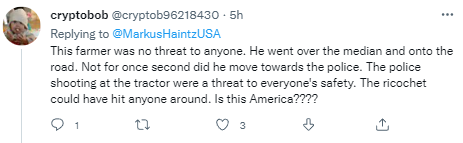 对于这样的场景,有人联想到美国。一名网友称:“这个农民对任何人都没威胁。他穿过马路中间、上了马路。他一秒钟也没向警察走去。(但)警察向拖拉机开枪对每个人的安全都构成了威胁。(子弹)乱飞可能会击中附近的任何一个人。这里是美国吗??”↓