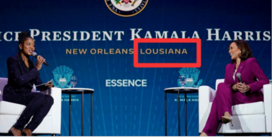 据报道,本月2日,哈里斯在新奥尔良市参加了一场活动并接受了采访。她当时身后的背景板上写着“副总统卡玛拉·哈里斯,新奥尔良,路斯安那(Lousiana)”,而该州州名的正确写法是“路易斯安那(Louisiana)”。英国《每日快报》称,目前尚不清楚拼写错误是活动主办方还是哈里斯的宣传团队造成的。↓