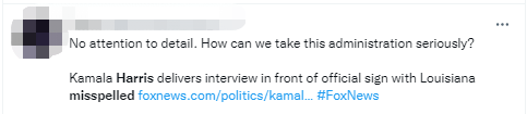 福克斯新闻网称,哈里斯和采访者在30分钟的谈话过程中没有注意到这一拼写错误,不过,网友们很快发现了这一问题。有人在推特上说:“不注意细节。让我们如何认真对待本届政府?”↓