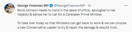 弗里曼在推文中写道:“约翰逊需要交出公章,向女王道歉,并建议她任命一位看守首相,以在今天接管(首相工作),这样部长们就能够继续工作,我们可以选择一位新的保守党领袖,努力弥补损失和重建信任。”